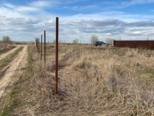 С одной стороны, участок имеет забор из профнастила, со второй стороны- огорожен сеткой-рабицей, со стороны въездной группы и по оставшемуся периметру, забетонированы железные столбы, под калитку, ворота и забор.