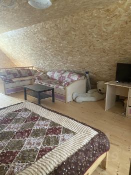 3 Второй этаж: 54 м² без перегородок — возможность организовать пространство по своему вкусу! В данный момент здесь 4 спальных места: двуспальная кровать и два полуторных дивана.