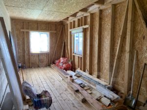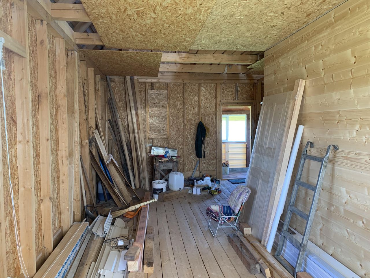 Дом каркасный, утеплён (стены и пол), фундамент винтовые сваи, кровля железо, внутренняя отделка только одна комната. Окна ПВХ в доме и на террасе.