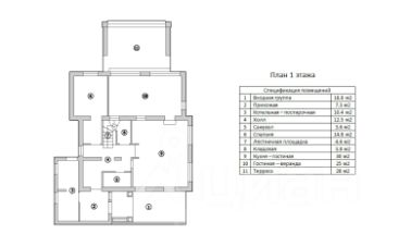 Планировка: на первом этаже прихожая, котельная-постирочная с дополнительным входом, холл, санузел, спальня (кабинет), кладовая, кухня-гостиная, гостиная-веранда с выходом на террасу. На втором этаже холл, санузел, 3 спальни. Под отделку.