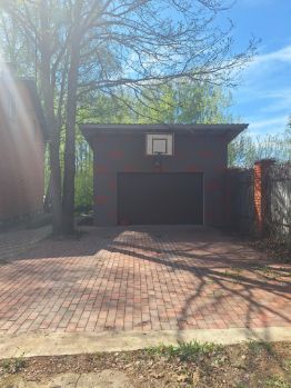 Гараж из блока, отштукатурен. Оборудован автоматическими воротами Horman 4х3 м (поднимаются вверх) и металлической входной дверью. Пол бетонная плита. Перед гаражом оборудована площадка, покрыта брусчатой плиткой, выдерживающей вес внедорожников.