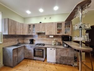 Дом включает в себя на первом этаже: терраса (3*10м), прихожая (оборудована теплыми полами), бойлерная, холл, лестница на 2-ой этаж, ванная комната (оборудована теплыми полами), гостевая спальня, кухня, объединенная с залом (4*10м2), потолки 3 метра; на втором этаже: туалет, холл, три спальни.