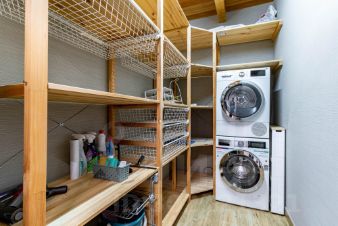 1 ЭТАЖ: котельная, прихожая с гардеробной, постирочная, санузел с душем, кухня-гостиная со встроенной бытовой техникой NEFF и Liebherr, выход на террасу, комната.