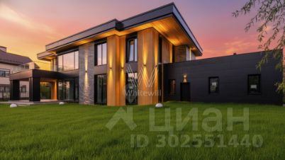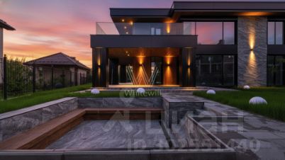Monteville. Загородный дом площадью 850 м² постороен на полевом участке 15 соток. Фасад здания выдержан в современном стиле, облицован серыми и черными панелями и декорирован деревом. Коттедж в отделке white box позволяет реализовать индивидуальный дизайн-проект. Планировкой резиденции предусмотрены 5 спален, гостиная, кухня, столовая, квартира для персонала и крытая терраса. В контуре дома расположен гараж на 2 машины. На участке выполнен ландшафтный дизайн и обустроена зона отдыха.