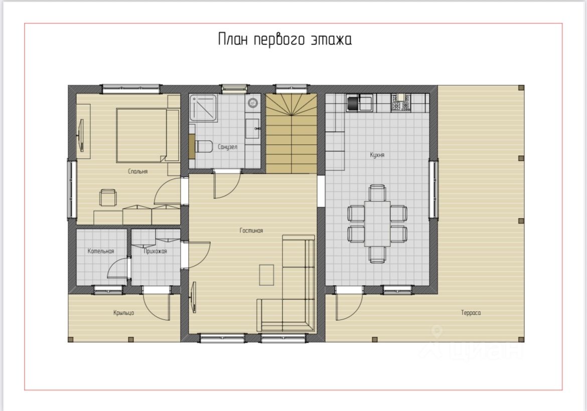 1-й этаж имеет две входные группы, кухню-столовую, большую террасу, гостиную, спальню, санузел с душевой кабиной, прихожую, котельную;