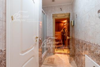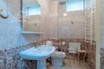 Описание внутренней отделки: выполнена классическая отделка дома с многоуровневыми потолками из гипсокартона, лепниной и большим количеством освещения. В отделке использованы натуральные материалы, мрамор, гранит, коллекционная плитка, на втором этаже ковролин, ламинат. Стены в комнатах покрашены, в санузлах плитка. Лестница железобетонная шириной 1,2 м, ступени из мрамора, с коваными патинированными перилами. Все санузлы укомлектованны необходимой сантехникой: круглая ванная-джакузи, душевые кабины, унитазы, биде, раковины. Все коммуникации разведены под ключ, теплые полы везде, где плитка, розетки и выключатели SIMON, радиаторы KERMI. Межкомнатные двери МДФ, светлые с филенками..