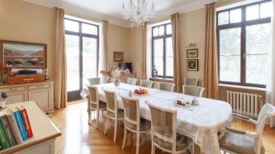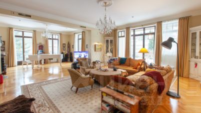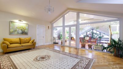 Резиденции Бенилюкс. Загородный дом в неоклассическом стиле площадью 973 м² расположен на просторном участке с парковыми дорожками и гаражом. Фасад дома в приглушенных тонах отличается большими панорамными окнами и декоративными колоннами. Интерьер дома выполнен в стиле современной классики, все комнаты меблированы и наполнены техникой. На 4 уровнях спланировали 6 спален с гардеробными комнатами, финскую и турецкую бани, домашний кинотеатр, винный и продуктовый погреба, спортивный зал и оранжерею. В доме современная инженерная система, подключены функции "умный дом", лифт проходит через все этажи.
