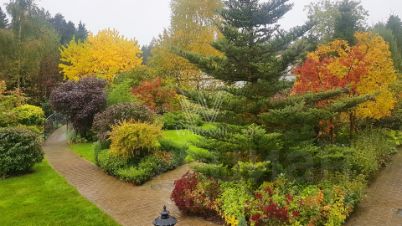 На участке 25 соток выполнили ландшафтный дизайн — посадили ровный газон, декоративные кустарники и хвойные деревья, дорожки вымостили плиткой. Около главного дома разместили теплую беседку с каменной печью и встроенным мангалом, и дом для персонала 122 м² с гаражом для 2 машин.