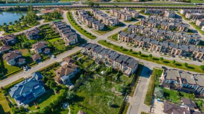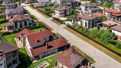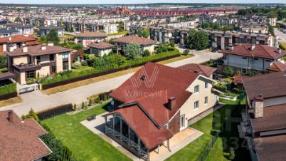 Покровский. Загородный дом площадью 470 м² построен на полевом участке 12,5 соток. Фасад в современном стиле облицован красным клинкерным кирпичом и бежевой штукатуркой. Благодаря высоким потолкам и панорамному остеклению пространство наполнено светом и воздухом. Интерьер выполнен в нежных пастельных тонах, создающих атмосферу уюта. В коттедже спланировали 5 спален, гостиную с дровяным камином, кухню-столовую, сауну, террасу и гараж на 2 машины с пристроенным навесом. На участке выполнен ландшафтный дизайн, вымощены дорожки, засеян газон и высажены туи.