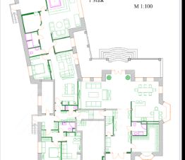 Гостевая зона (либо автономная зона для другой семьи, возможно, с отдельным входом): холл с выходом на террасу, 2 спальни, СПА-зона с с/у и сауной, гардеробная, кухня-столовая-гостиная; гараж с проходом в основную зону и зону проживания персонала;