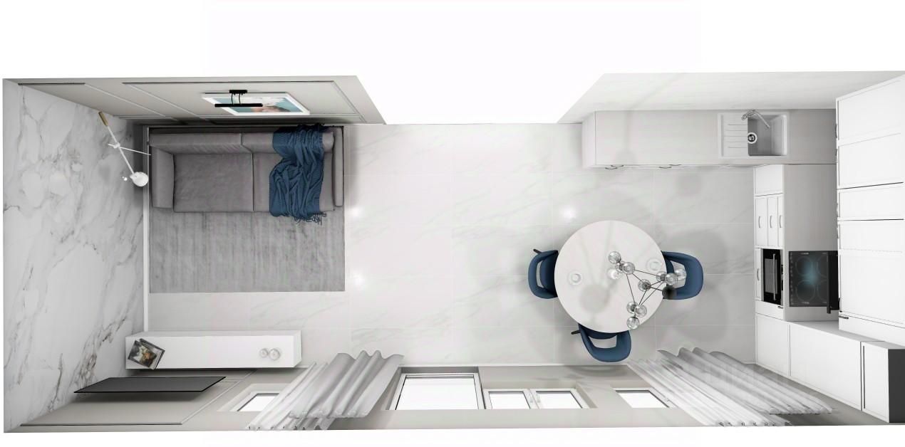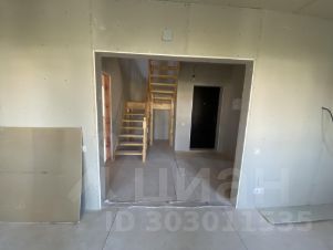 На первом этаже - большая кухня-гостиная с выходом на террасу, санузел, спальня.