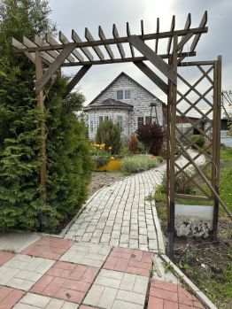 - участок облагорожен кашпо и декоративными растениями: туи, елочки, кусты и многочисленные цветы