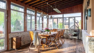 1 этаж: гостиная-столовая-кухня, кабинет, выход на летнюю веранду; санузел, постирочная и отдельный блок свободного назначения (65 кв.м.)