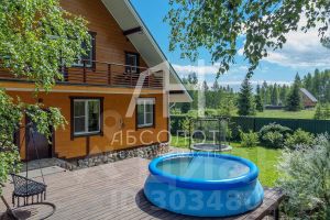 На территории расположена терраса, бассейн, батут, качели.