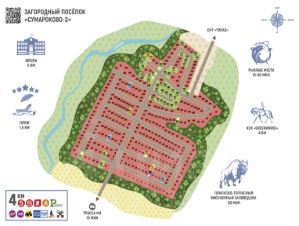 Инфраструктура поселка: КПП, электричество по границе участка -15 кВт, идет газификация, уличное освещение, круглосуточная охрана. Есть детский игровой комплекс и зона отдыха. Регулярно осуществляется уборка территории и вывоз мусора. Поселок уже заселен.
