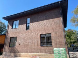 Дом выполнен из монолитного фундамента шириной 400 мм, монолитная плита, стены из газобетонных блоков с утеплением и облицовкой керамическим кирпичом, перекрытия между этажами плиты, монолитная лестница, покрытие кровли металлочерепица с утеплением 200 мм.