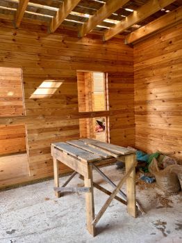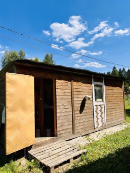 На участке есть бытовка для проживания рабочих и уличный туалет.