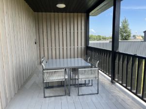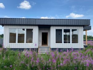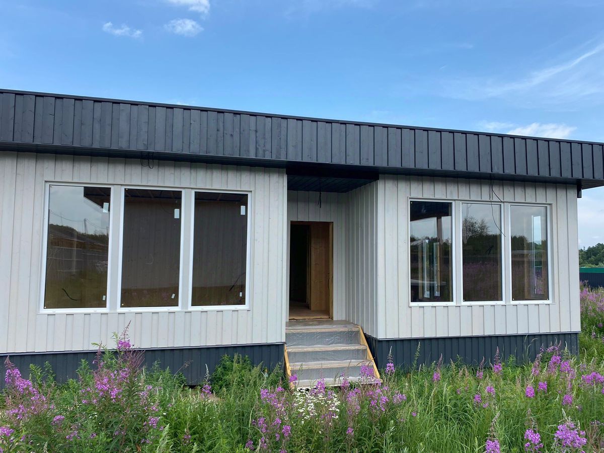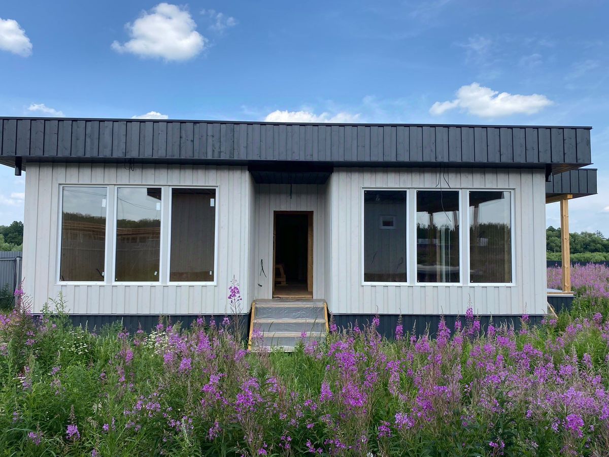 Дом каркасный, утепленный. Удобная планировка - три изолированные спальни, просторная кухня-гостиная, санузел и гардеробная комната. Большие панорамные окна в гостиной и кухне создают уют, дом очень светлый и солнечный.