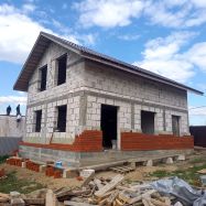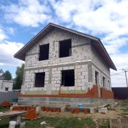 Стены дома из газосиликатного блока с внешним утеплением (толщина стены 42 см). Фасад облицован кирпичом, кровля металлочерепица, окна пластиковые стеклопакеты Rehau, фундамент ленточно-свайный, залиты монолитные плиты перекрытия.