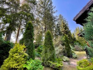 Ландшафтный дизайн: вековые ели, сортовые хвойные деревья, яблони, груши, розы, пионы.