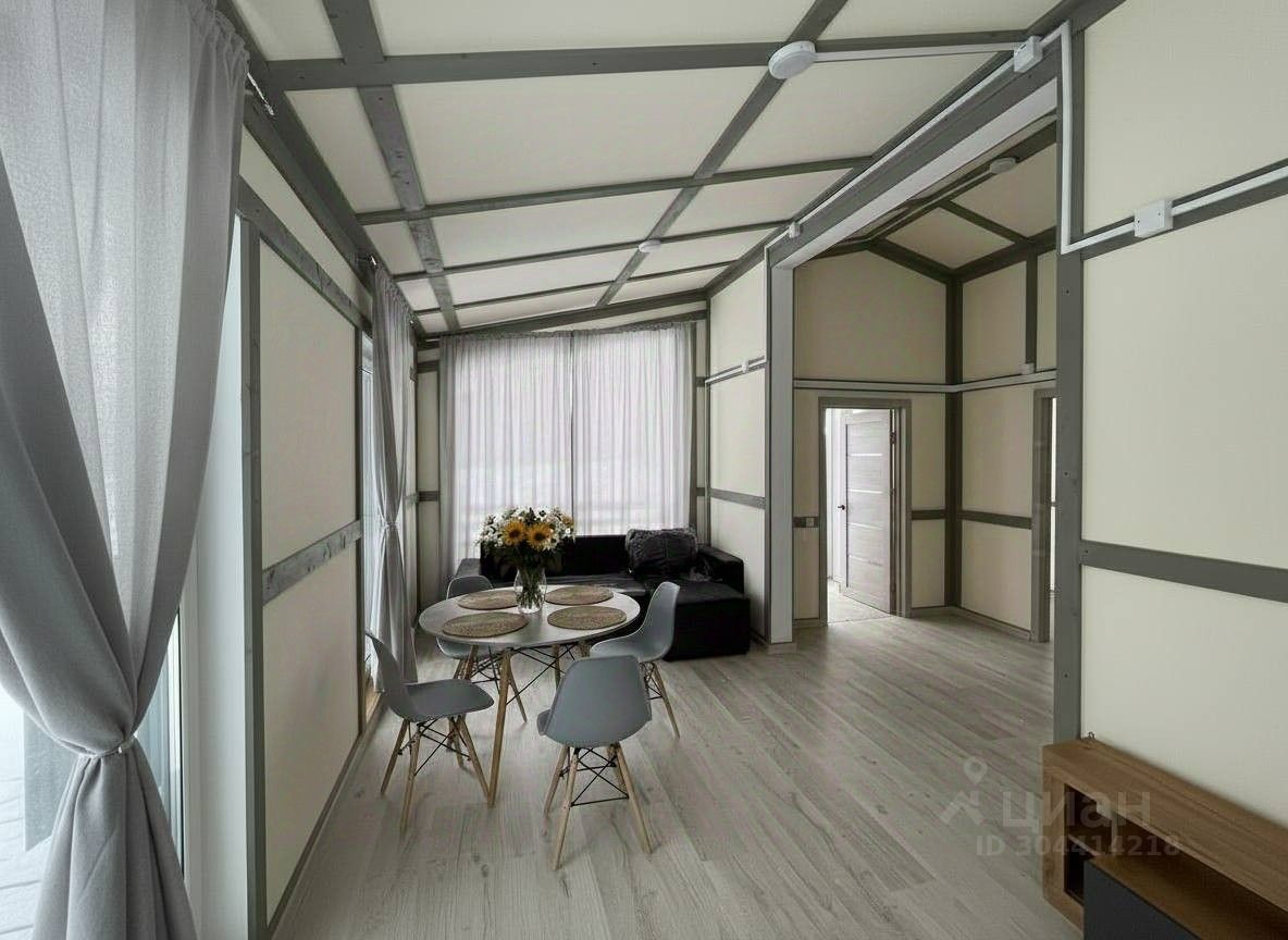 Дом (каркасный) - с функциональной и уютной планировкой: просторная гостиная с кухонным блоком, 2 спальни, гардеробная. Качественная внутренняя отделка, полная меблировка.