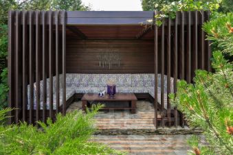 На участке предусмотрен ГОСТЕВОЙ ДОМ (180 кв.м) с банным комплексом и объединен с главным домом общим патио. Зонирование дома распределено на 3 блока с собственными выходами: