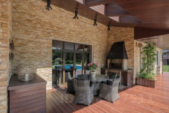 На участке есть зона барбекю с мангалом, беседка для отдыха, БАССЕЙН 10*5м, освещение и декоративная подсветка, автоматический полив, парковка для 2-х авто (под навесом).