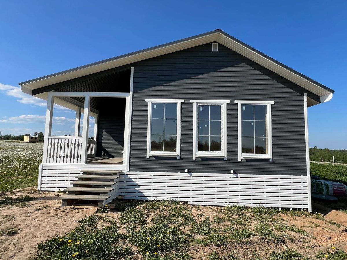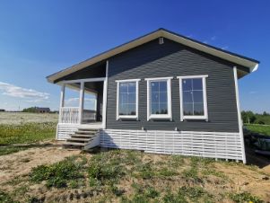 Фундамент свайно-винтовой, основание дома из бруса 150х200 мм, силовой каркас выполнен из доски 40х150х200мм, утепление Rockwool 200 мм, окна ПВХ с двойным стеклопакетом, металлочерепица.