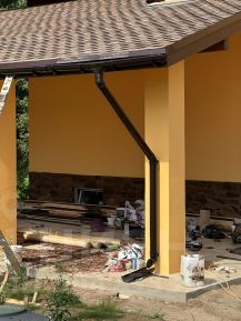 Снаружи фасад и цоколь выложены натуральным камнем "кора дерева", ОЧЕНЬ КРАСИВО смотрится.