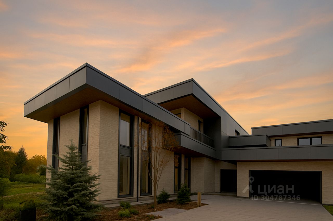 Фасад с большими панорамными окнами выполнен в современном стиле и облицован натуральным камнем.