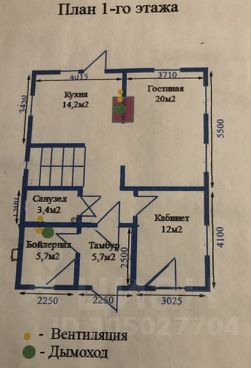На первом этаже прихожая 5.7 кв.м, бойлерная 5.7 кв.м, санузел 3.4 кв.м, кабинет/ спальня 12 кв.м, кухня 14.2 кв.м с выходом на задний двор, гостиная 20 кв.м.