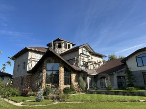 Гостевой Дом ПОД КЛЮЧ! имеет 3 уровня: цоколь+1 этаж+мансарда, соединен с основным домом через цоколь. Построен из кирпича в едином архитектурном стиле с основным домом.