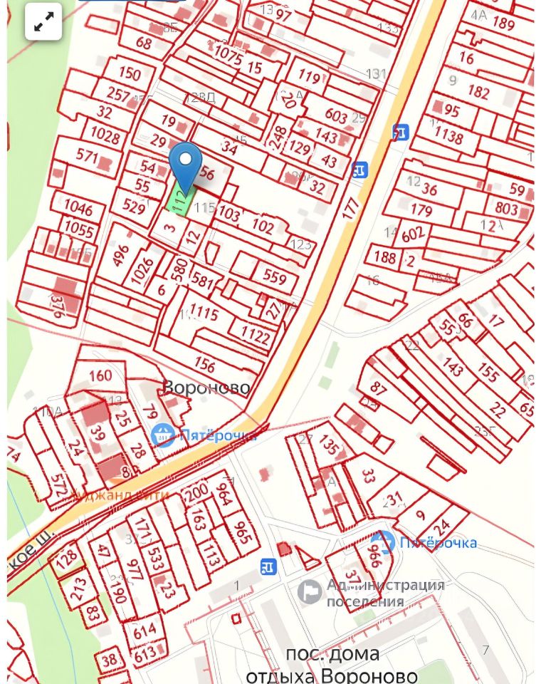Находится в центре села Вороново, до ТЦ "София" 5 мин. шагом. От Калужского шоссе 150 м., 3 линия, подъезд асфальтированный. Соседи с 4 сторон проживают круглогодично.