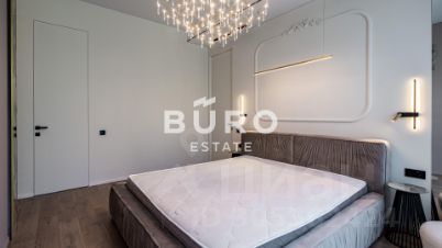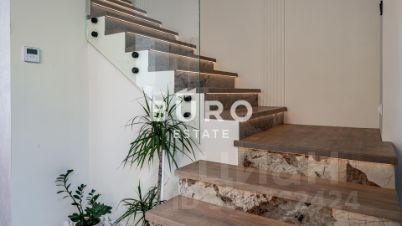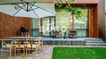 В таунхаусе выполнена дизайнерская отделка "под ключ" из премиальных материалов, в том числе использовались паркет и итальянский керамогранит. Современный интерьер дополнен стильной мебелью, предметами декора и бытовой техникой "Kuppersbusch". Панорамное остекление "во всю стену" с вдохновляющим видом на собственный дворик создает ощущение единения с природой. В санузлах установлена сантехника ведущих брендов.