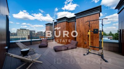 На четвертом этаже: сауна, душевая и эксплуатируемая кровля с шезлонгами для отдыха на свежем воздухе. По периметру открытой террасы установлено прозрачное ограждение для безопасности.