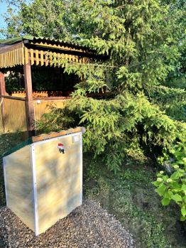 На участке есть все для комфортного отдыха: большая беседка 3 на 3 метра, мангальная зона, летняя кухня (отдельный небольшой домик), крытый дровник, небольшая баня с парилкой и душем.