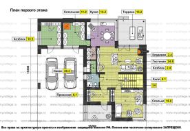 1-й этаж: кухня-15,2 кв.м., гостинная-24,8 кв.м., спальня-18,8 кв.м., санузел, кладовая, прихожая, котельная, терраса, хозблок.