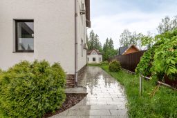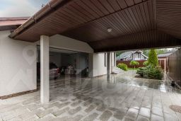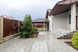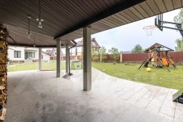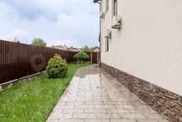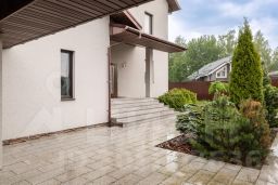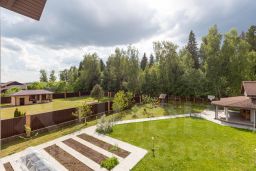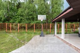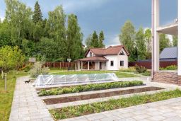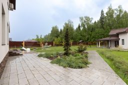 На участке хвойные растения, декоративные и плодовые деревья и кустарники, детский игровой комплекс, баскетбольная стойка. Широкие прогулочные дорожки, материал гранит.