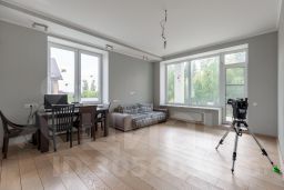 Полы плитка, половая доска (дуб). Двойные стеклопакеты, светлые мраморные подоконники, двери из натурального дерева.