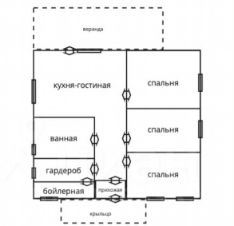 Большая терраса, прихожая - тамбур, просторная кухня - гостиная, 3 изолированные комнаты, совмещенный санузел, бойлерная, гардеробная(может быть легко трансформирована во второй санузел).