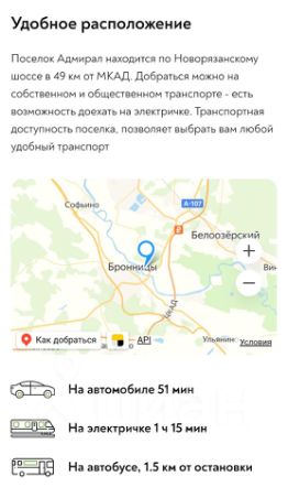 Вблизи поселка г. Бронницы старинный уютный город на берегу Москвы-реки с большим числом исторических достопримечательностей и величавым Архангельским cобором (1705 год). Сегодня город отличает хорошая транспортная доступность от Москвы на автомобиле и электропоезде с Казанского вокзала. Здесь новые дороги, большие торговые центры и кинотеатры, разноплановая современная инфраструктура и насыщенная общественная жизнь.