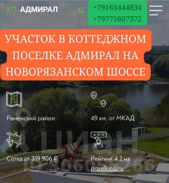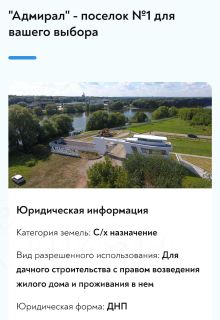Элитный участок в поселке Адмирал - идеальное место для постоянного или сезонного проживания. Поселок расположен в 45 км от Москвы по Новорязанскому шоссе. В 300 метрах от поселка полтора километра собственной береговой линии Москвы-реки, где будут созданы прогулочный бульвар, пляж и зоны отдыха.