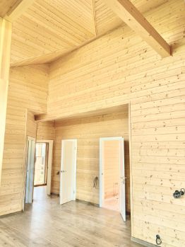 Дом теплый, уютный, с высокими потолками и панорамным остеклением холла.
