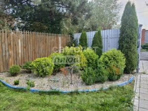 По периметру участка красиво высажены декоративные деревья. На участке так же растут туи, ель, цветы. Оборудовано несколько грядок.