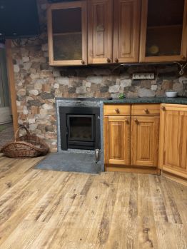 Из гостиной выход на просторную веранду (44м2) на северной стороне с видом на лес, летом прибывать на веранде комфортно и в жару прохладно, на веранде расположена печь - камин.