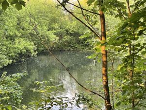 На участке лесные и плодовые деревья. За забором лес, большой пруд.
