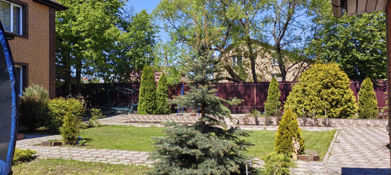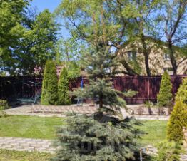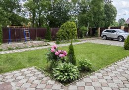 На участке сделан ландшафтный дизайн с дорожками, зонами отдыха.