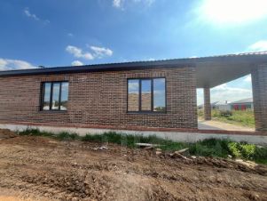 Планировка: кухня-студия, мастер спальня+2 спальни, котельная, санузел, прихожая, тамбур, терасса, гардироб.