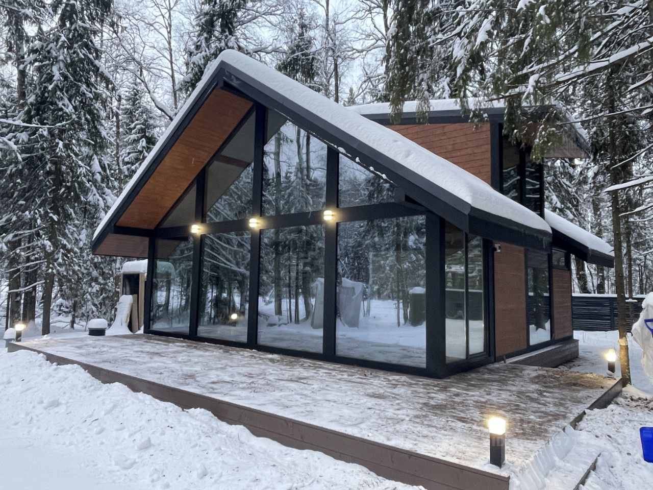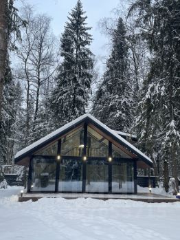 Остекление выполнено из мультифункционального закаленного стекла толщиной 8мм, снаружи напыление стекла отражает ультрафиолетовые лучи, изнутри напыление отражающее тепло. Стеклопакеты энергоэффективные, двухкамерные с теплой рамкой. Входная дверь с терморазрывом.