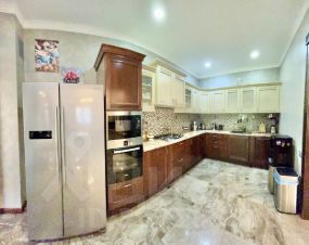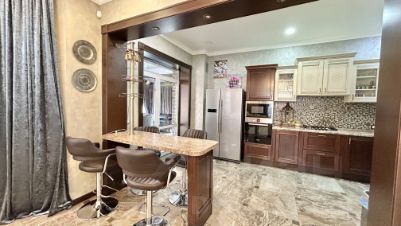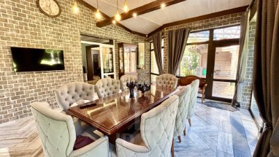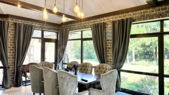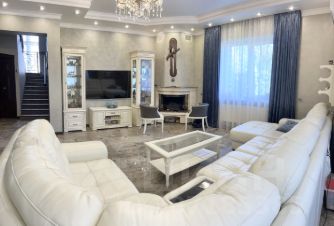 Внутри дом отделан качественными современными материалами: на полах керамогранит и паркетная доска, стены отделаны декоративным камнем, кирпичом, оклеены обоями немецкого производства, установлены дорогие межкомнатные двери. По всему первому этажу разведены теплые полы. Дом укомплектован мебелью и сантехникой.